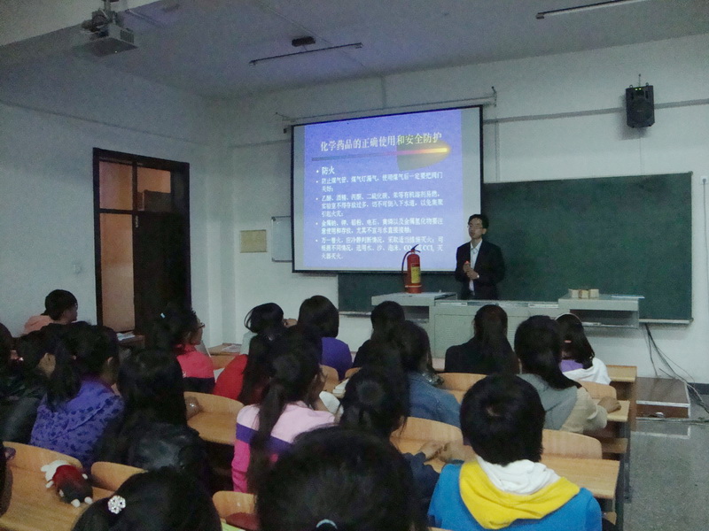 关经理以公司员工最常见的化学、食品以及制药工程类实验室为例详细讲解实验安全的相关知识。在讲到化学实验应注意的安全问题时,关经理强调,进实验室要注意化学药品的正确使用和安全防护,注意防毒、防火、防爆、防灼伤,安全使用有毒化学药品和实验室中的仪器设备,多学习一些处理实验室安全事故的正确措施和方法。介绍制药工程实验室时,关经理指出安全意识的养成十分重要,对于每一个新进入实验室的员工都应该认真执行指导教师严格的操作手法,以使其掌握正确的要领,保证以正确的意识、操作技术和实验习惯。他从日常管理规范和人员管理规范两方面对员工作了具体要求:上实验课必须穿实验服;使用危险化学药品做好安全防护措施;做好实验室通风和卫生保持工作。此外,关经理还列举一些由于缺乏安全意识而引发的实验室安全事故,告诫同学们上实验课一定要听从老师的安排,提高安全防范意识,避免给他人和自身造成不必要的伤害。