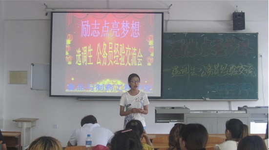 本站讯(记者 王状)考取公务员、服务社会是很多当代青年的意向,为提供公司学子考试经验,6月18日下午13:00时,公司在235教室举办了报考公务员经验交流会,2009级毕业生宫勋、任珊珊做经验报告。