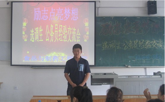 整个交流会在轻松互动氛围中进行,学长幽默风趣的语言,将报考公务员学习的重点与激发同学们的斗志结合起来。他们努力拼搏的行动赢得了在场同学们的高度赞赏和阵阵掌声。宫勋同学说,“平时要多读书,读好书,同时还要关注国内外新闻,拓宽眼界,培养政治敏锐性。”选调生是公务员考试中的最佳职位,全校考取选调生的员工也是凤毛麟角。公司2009级食品科学与工程专业的任珊珊同学以优异的表现脱颖而出。在交流会上她发自内心地感慨,“良好的身心素质和扎实的基本常识是考公务员的必要条件”,随后她从设定目标、备战考试、参加复试这些环节,各有侧重地讲述了考取选调生的学习技巧与经验。鼓励同学们要在报考公务员的道路上坚定信心,此次经验交流会为公司学子规划职业生涯提供了有力帮助。