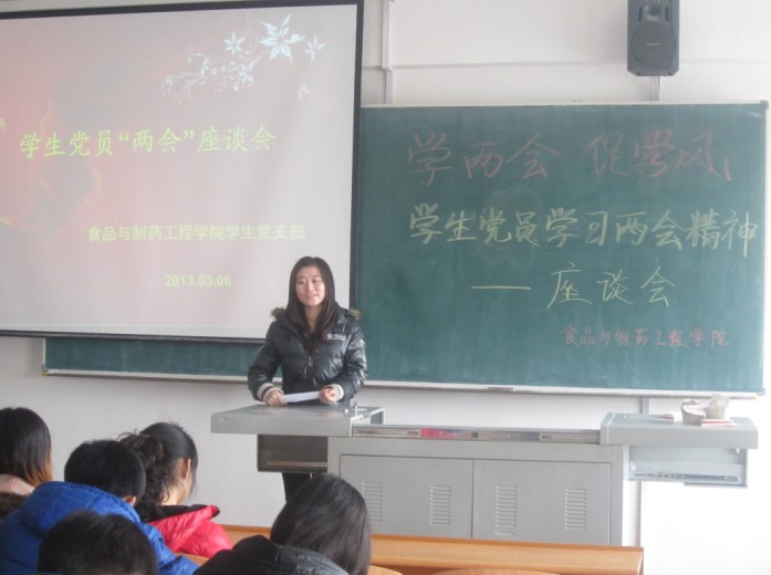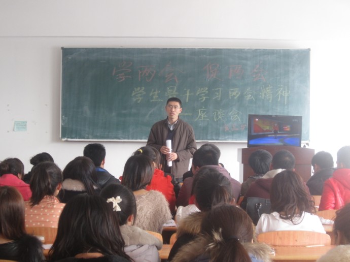 随后同学们展开了热烈的座谈,2010级于飞羽同学说:“温总理在《政府报告》中,提出关于中央财政拟投入433亿元用于促进就业工作,并鼓励高校毕业生到基层、中小企业就业,做为大三的员工,对于未来的就业充满希望。2011级的高璐璐同学说,做为一名新党员,通过学习“两会”精神,感觉到我们的祖国越来越强大,身为一名中国人,感到无比的自豪与骄傲。
