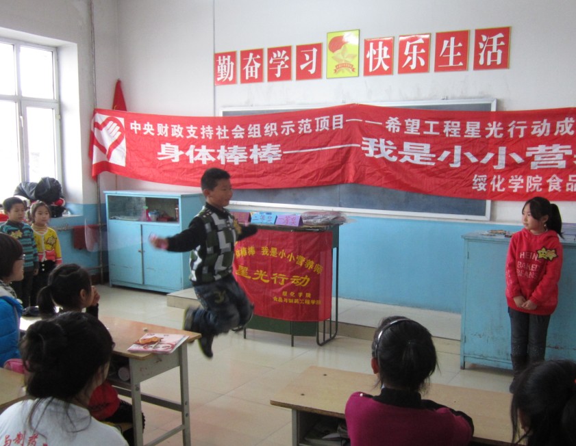 由于前期精心的准备,在进入班级后志愿者们很快拉近了与孩子们的距离,随后顺利地开展了多种多样的活动。在“比赛转篮球”环节中,蒋宇带领孩子们玩的非常开心,与孩子们打成一片并排出一二三等奖,给孩子们鼓励;接下来的“表演节目”环节,孩子们都自告奋勇地上前唱歌跳舞;于飞羽带领大家进行”比赛跳绳”游戏,孩子们都玩的不亦乐乎,并给他们送去了小礼品。不仅如此,孩子们还将对大哥哥大姐姐的祝福写在纸片上,互送信件,并以短信的形式互赠祝福。活动现场充满温馨;最后,志愿者们把带去的铅笔、本子送到孩子们手中并合影留念,为本次活动画上了圆满的句号。